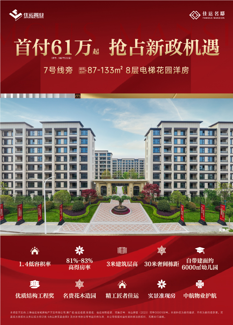 佳運名邸位于北上海,容積率僅1.4低密度、僅8層花園洋房,居住舒適度高,遠比高層房屋更適合居住。應急疏散方便,私密性好,人均占地面積大,優(yōu)秀房型、一梯二戶沒有連廊,81%-83%高得房率、東西面寬大、幢距達30米、優(yōu)質(zhì)工程、高端綠化景觀、層高高、實景現(xiàn)房,這些都是絕無僅有的硬核優(yōu)勢。